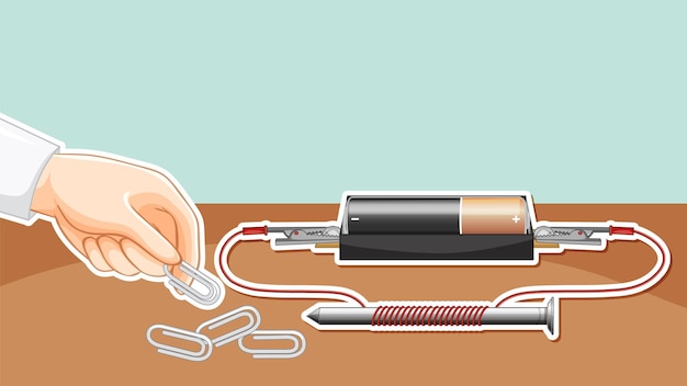- Podłączenie do zasilania: Podłącz końcówki drutu do biegunów baterii, zwracając uwagę na polaryzację; prawidłowe połączenie zapewni właściwe działanie elektromagnesu.